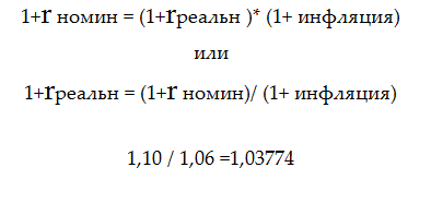 Допустим, имеется номинальный денежный поток 1000 у. е., который можно вложить в банк под 10% годовых (номинальная процентная ставка), тогда через год вы получите 1100 у. е. Но что произойдет, если уровень цен за этот год вырастет на 6 %. Это означает, что через год вы сможете купить на 6% меньше товаров, чем сегодня, а более точнее на сумму равную 1100/(1+0,06) = 1037,74 у. е. Это означает, что ваши номинальные денежные поступления величиной 1100 у. е. через год, составляют всего лишь 1037,74 у. е. сегодня.