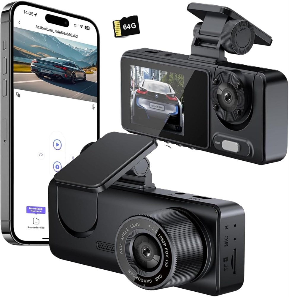 3-канальный видеорегистратор, камера 1080P Full UHD, передняя и задняя камера, встроенная карта памяти на 64 ГБ, встроенная система ночного видения, 2-дюймовый IPS-экран, широкоугольный объектив 170°, WDR, режим парковки 24 часа, циклическая запись