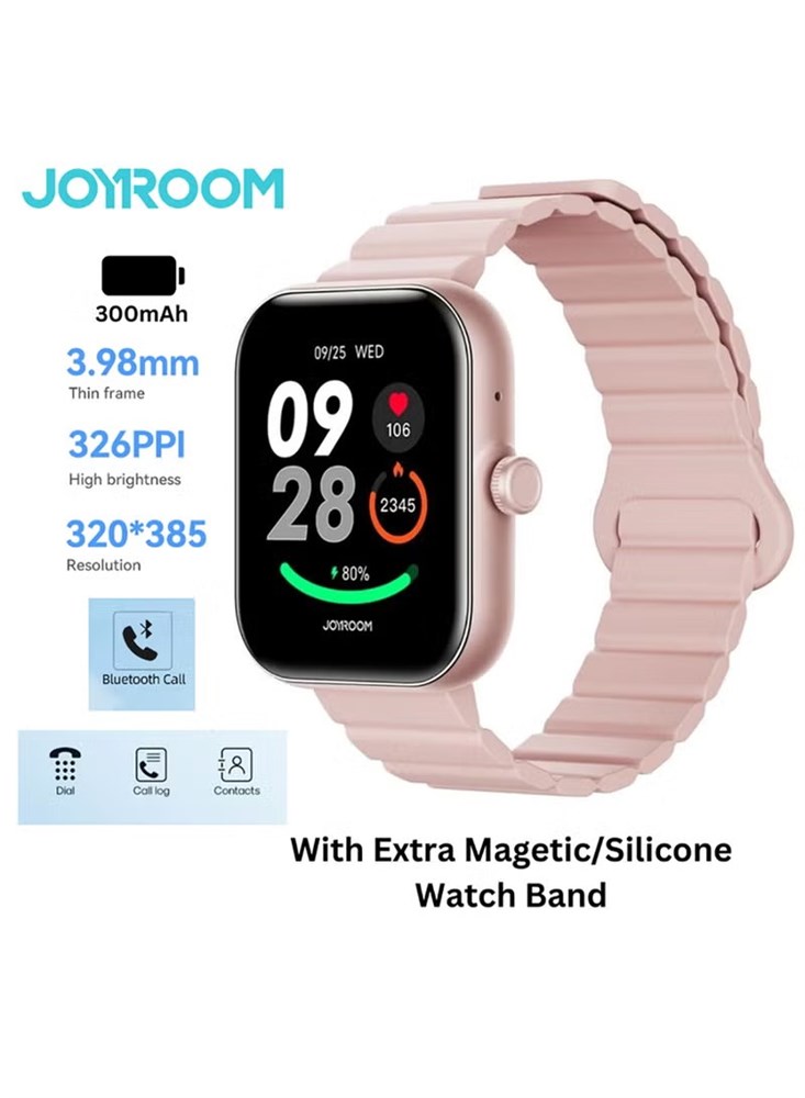 Смарт-часы JR-FT5 PLUS емкостью 300 мА·ч. Возможность совершать и принимать звонки. 1,96-дюймовый HD TFT-дисплей. Подключение по Bluetooth. Мониторинг фитнеса. Совместимость с Apple и Android. Магнитные и силиконовые браслеты. Цвет: розовое золото.