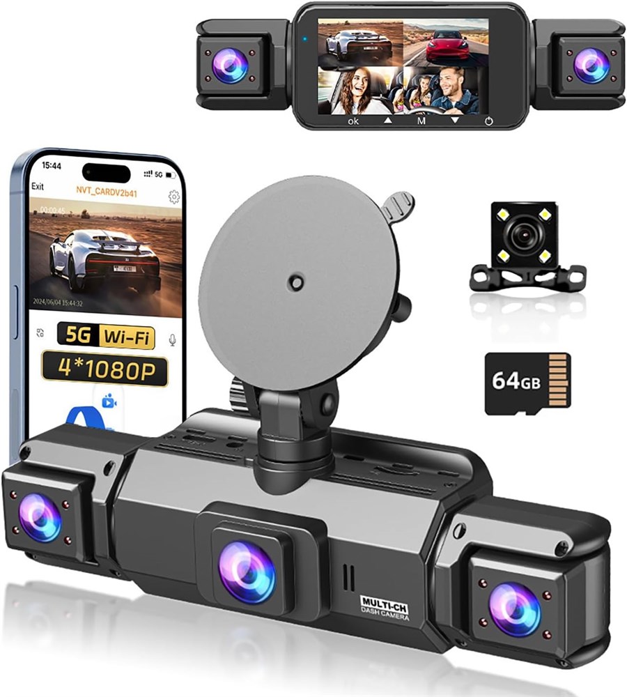 4-канальный видеорегистратор с обзором 360° спереди и сзади слева и справа, камера салона для автомобилей, GPS и Wi-Fi 5G, ночное видение, широкоугольный объектив 180°, WDR, режим парковки 24 часа, в комплекте карта памяти на 64 ГБ