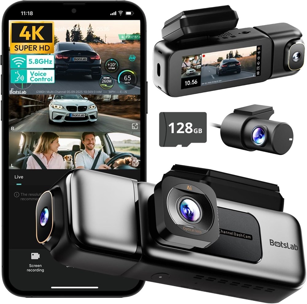 3-канальный видеорегистратор Botslab 4K с картой памяти 128 ГБ, сенсорным экраном 3,18 дюйма, голосовым управлением, циклической записью видео спереди 4K и сзади 1080P, Wi-Fi 5,8 ГГц, GPS, ночным видением, WDR, режимом парковки