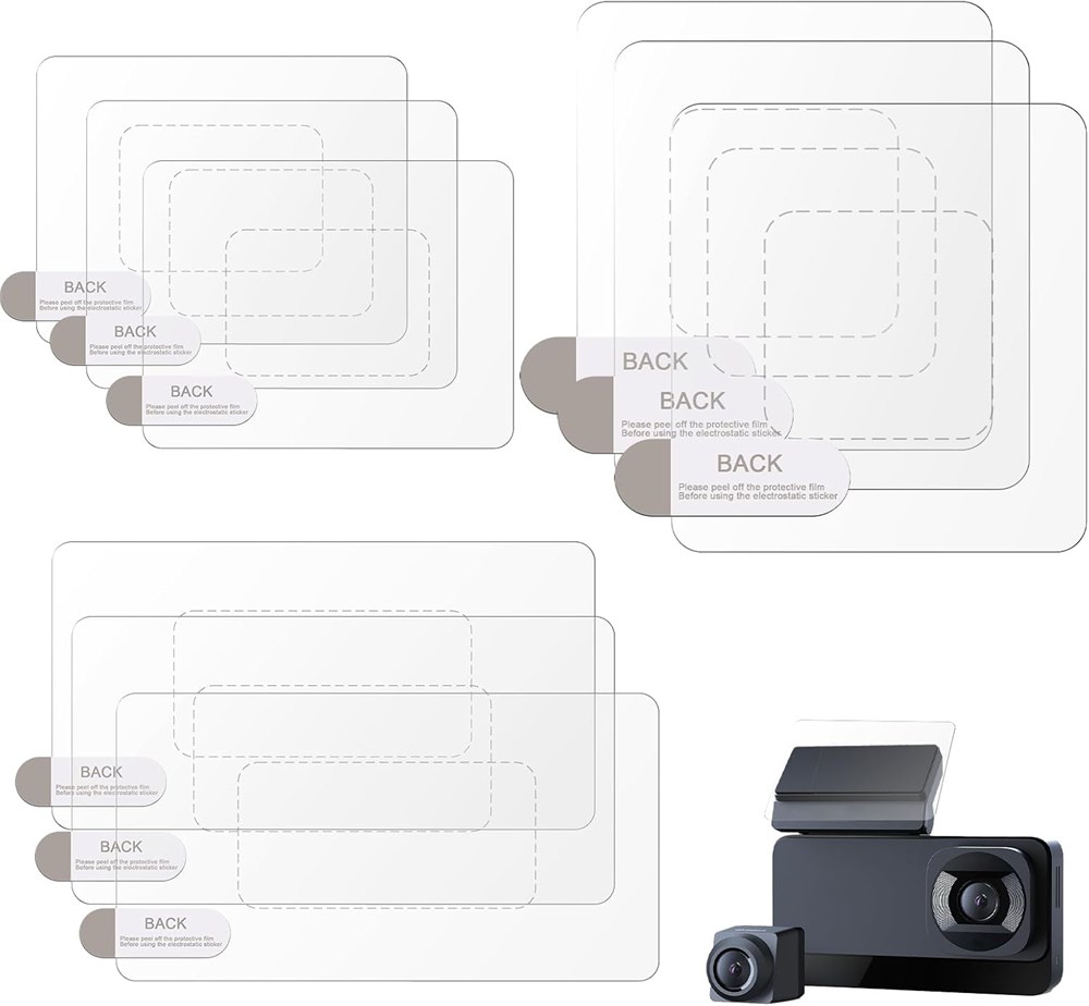 Электростатическая плёнка для крепления видеорегистратора, упаковка из 9 прозрачных статических наклеек на лобовое стекло автомобиля, защитные покрытия без следов, 3 размера, простая установка, многоразовые, не требуют использования клейкой ленты.