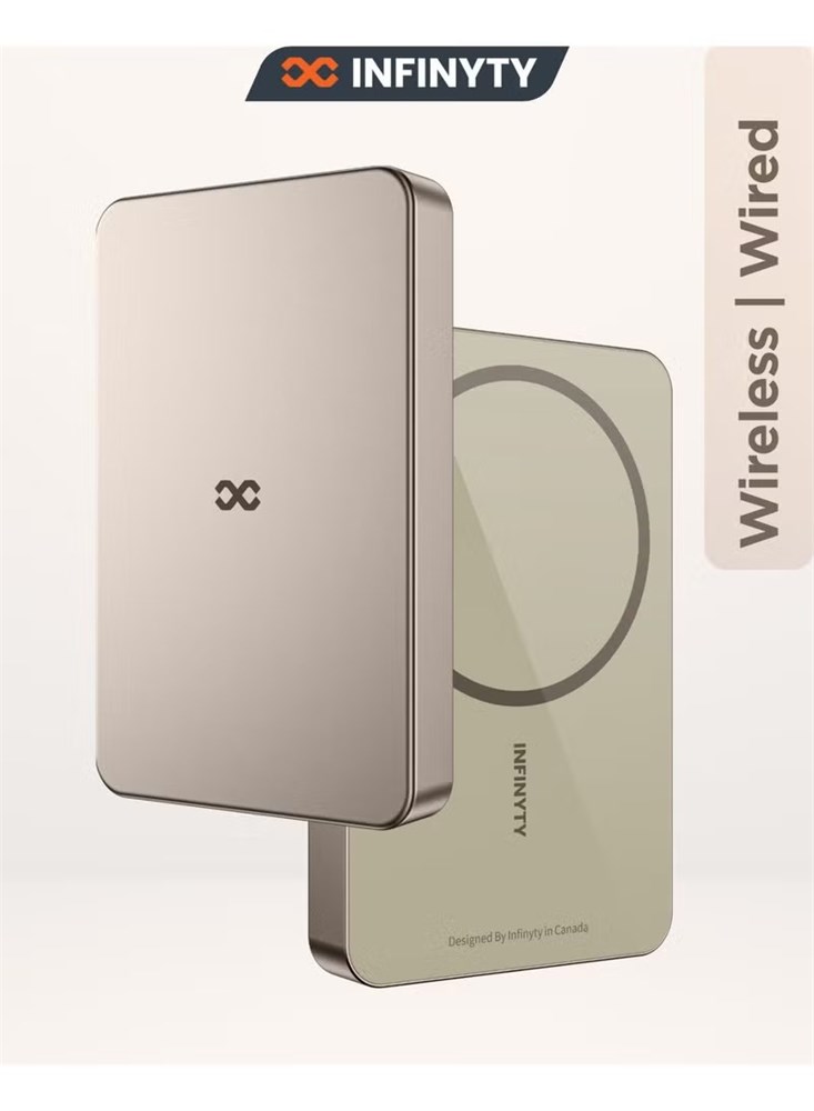 Внешний аккумулятор ёмкостью 10000 мА·ч с проводной и беспроводной зарядкой, совместимость с Magsafe, гарантия 1 год, цвет Desert Titanium, ультратонкий корпус 12,4 мм, быстрая зарядка через USB-C мощностью 20 Вт, компактный, лёгкий, портативный, корпус и