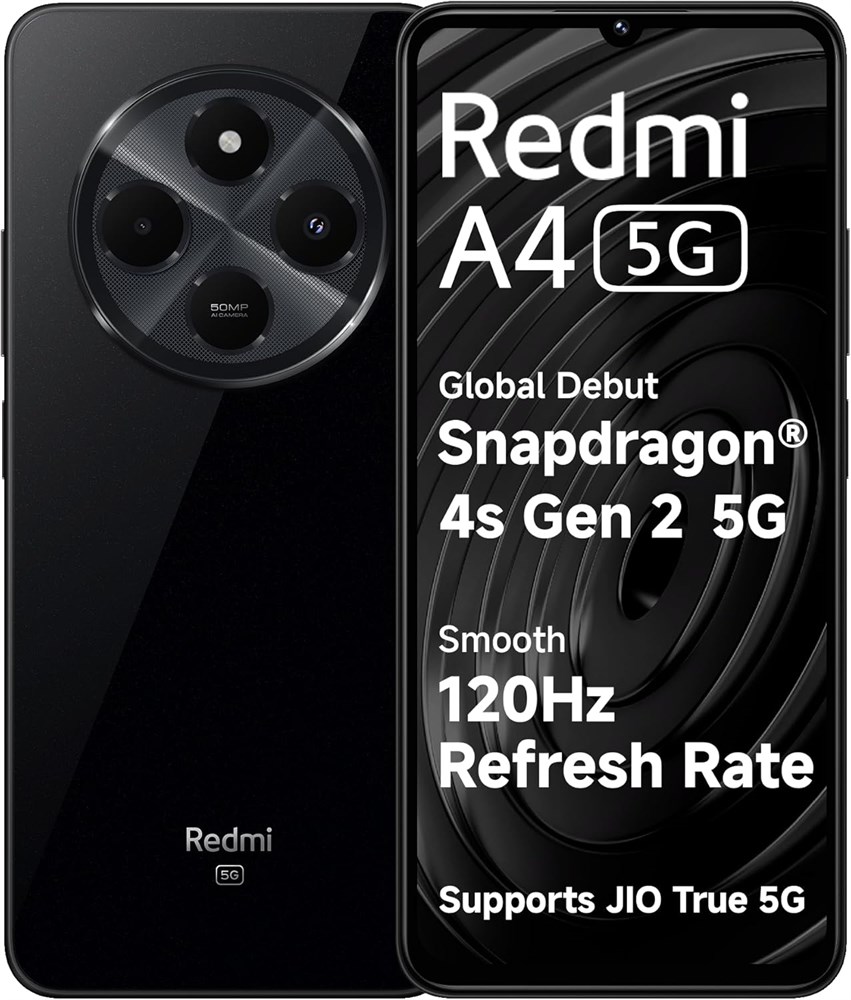 Redmi A4 5G (звёздно-чёрный, 6 ГБ ОЗУ, 128 ГБ встроенной памяти) | Крупнейший в сегменте смартфон с экраном 6,88 дюйма и частотой обновления 120 Гц | Двойная камера 50 МП | Быстрая зарядка 18 Вт | Зарядное устройство в комплекте | Версия для Индии