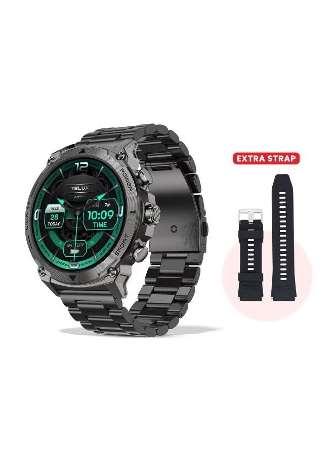 Умные часы TELUX ACTIVEX с функцией звонков, дисплей AMOLED 1,43 дюйма, 2 ремешка (нержавеющая сталь и силикон), голосовой помощник на базе искусственного интеллекта, отслеживание сна, более 100 режимов, водонепроницаемость IP67, аккумулятор на 10 дней, п