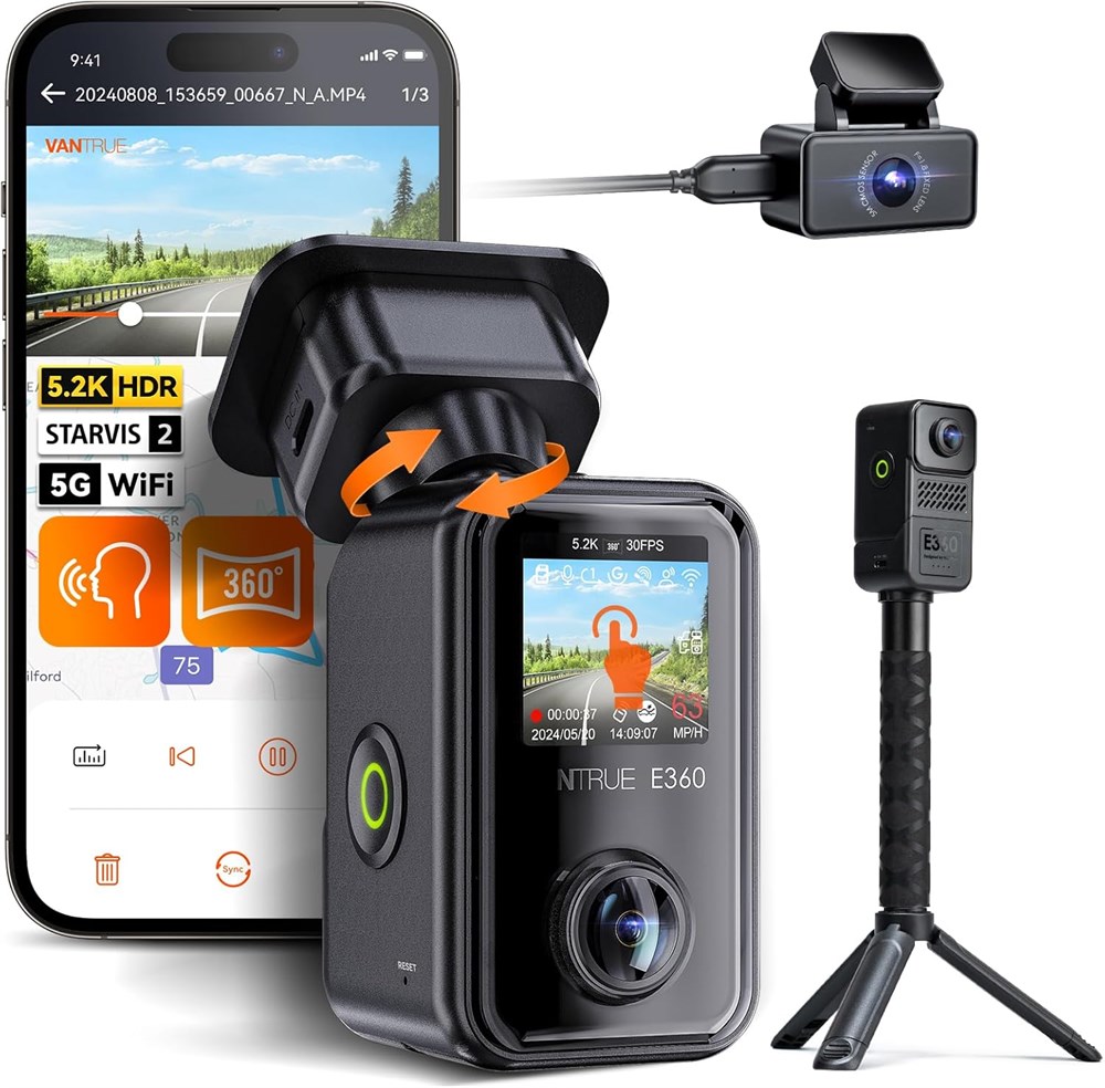 Панорамный WiFi-видеорегистратор Vantrue E360 ACE 5.2K 360°, ручная камера, STARVIS 2, HDR, ИК-подсветка ночного видения, камера спереди и сзади, голосовое/сенсорное управление, GPS, режим круглосуточной буферизации парковки, поддержка до 512 ГБ доставим до вашей двери по всему Таджикистану.